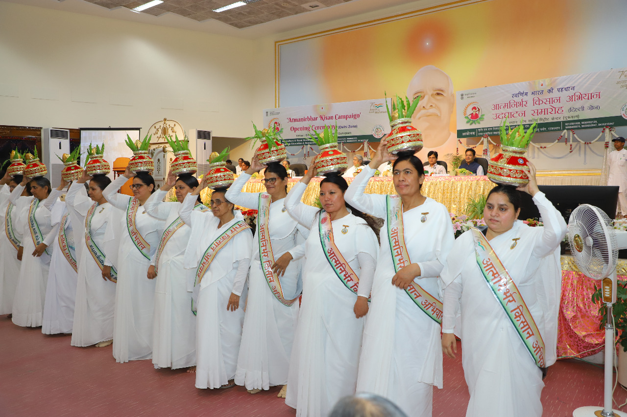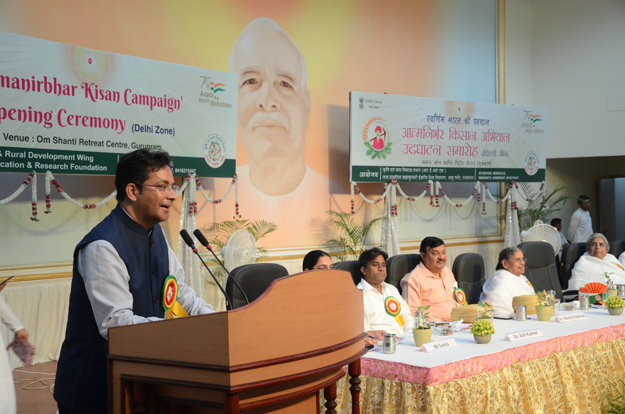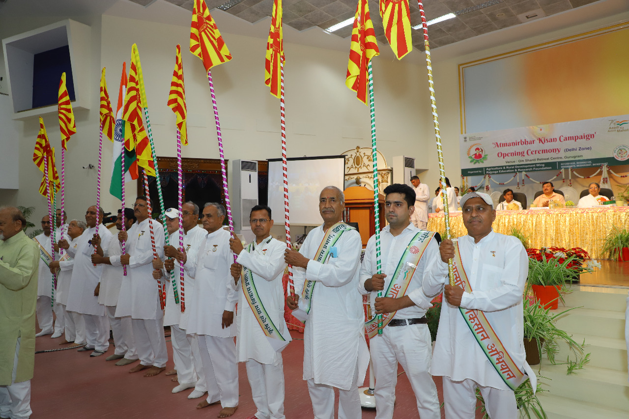 – देश की शान आत्मनिर्भर किसान … का संदेश देते हुए ब्रह्माकुमारीज संस्था के ओम शांति रिट्रीट सेंटर, गुरुग्राम में आत्मनिर्भर किसान अभियान  का भव्य आगाज किया गया। शनिवार को दादी प्रकाशमणि ऑडिटोरियम में आयोजित कार्यक्रम में हरियाणा के कृषि एवं किसान कल्याण मंत्री जेपी दलाल, ओआरसी की निदेशिका बीके आशा दीदी एवं ब्रह्माकुमारीज़ के कृषि एवं ग्राम विकास प्रभाग की संयोजिका बीके राजकुमारी ने हरी झंडी दिखाकर अभियान का शुभारंभ किया। कार्यक्रम में तिलक, बैज एवं अभियान के ध्वज के द्वारा भी सदस्यों ने अभियान की तैयारी की।