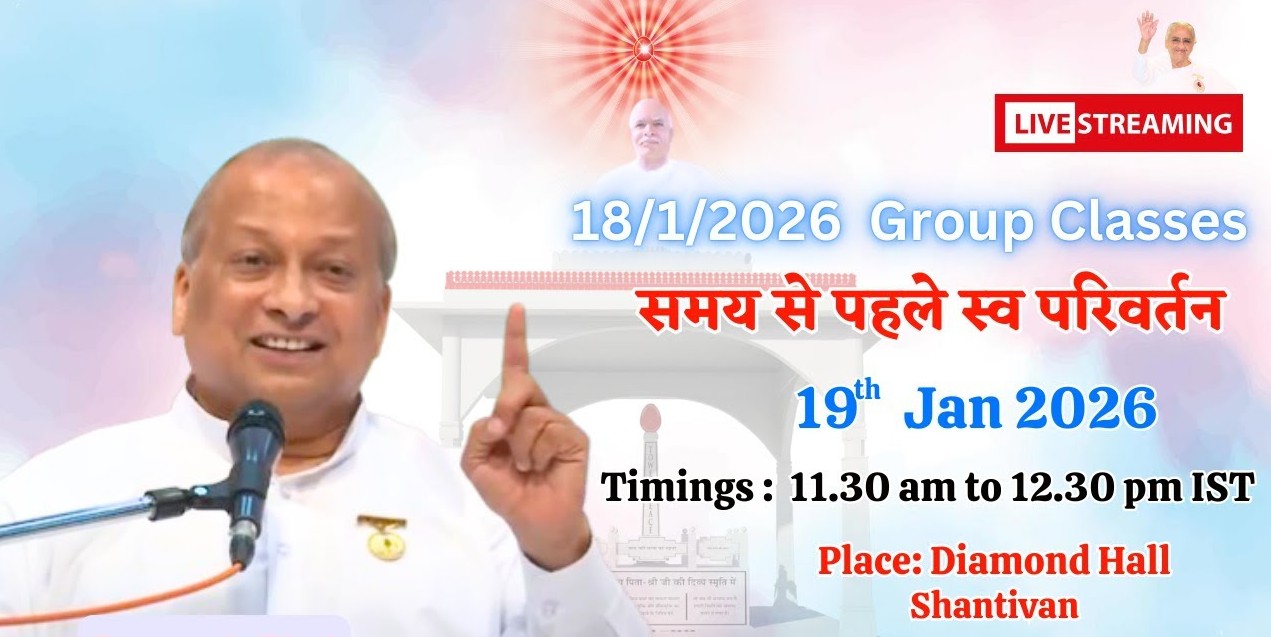 BK Ramnath Bhai समय से पहले स्व-परिवर्तन रामनाथ भाई जी डायमंड हॉल Published 3 weeks ago on January 19, 2026 By admin 11:30 – 12:30 क्लास: समय से पहले स्व-परिवर्तन रामनाथ भाई जी डायमंड हॉल LIVE: राजयोगी डॉ. सतीश गुप्ता भाई क्लास – ब्रह्मा बाबा के मुख्य 8 कदम || 19/1/2026, 5.30 PM 10:30 – 11:00 – क्लास: साकार बाबा के साथ अनुभव शिवकुमार भाई (दिल्ली) Related Topics:BK RamnathBrahmakumarisDr satish Guptalive Don't Miss 01st Dec Live Event , BK Atamprakash, BK Sheilu, Dr. Satish Gupta Continue Reading Advertisement You may like Rajyogi Mohan Singhal Bhai Class – Balance, Blessing, Blissful Live: Opening Ceremony of Brahma Kumaris, Trivandrum | BK Jayanti Didi | 29 Jan. 2026 | 09:00 AM LIVE: राजयोगिनी कृति दीदी क्लास – यथार्थ योग और उसका प्रयोग || 29/1/2026, 10.30 AM, Diamond Hall Live:- सम्मान समारोह | Sammaan Samaaroh | Brahma Kumaris, Palakad | 27 Jan. 2026 9:00 AM LIVE 🔴: 26 Jan. गणतंत्र दिवस की शुभकामनाएं | Live From Shantivan | Brahma Kumairs | 26 Jan. 2026 Live: संगम: गौरवशाली वृद्धावस्था और सम्मान का जीवन।, Anjar Kutch (Guj)| 25 Jan. 2026 | 10:00 AM Live : Golden Jubilee Celebration | Brahma Kumaris Madurai | 25-01-2026 | 9:00 AM LIVE Today’s 18 Jan 2026, Avyakt Baba Milan from Shantivan LIVE : 18 Jan. अव्यक्त स्मृति दिवस | Live From Madhuban | Brahma Kumairs | 18 Jan. 2026