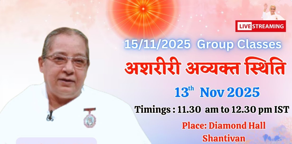BK Ambika LIVE: राजयोगिनी डॉ. सविता दीदी क्लास – अशरीरी अव्यक्त स्थिति || 13/11/2025, 11.30 AM, Diamond Hall Published 14 hours ago on November 13, 2025 By admin LIVE: राजयोगिनी डॉ. सविता दीदी क्लास – अशरीरी अव्यक्त स्थिति || 13/11/2025, 11.30 AM, Diamond Hall LIVE: राजयोगिनी अम्बिका दीदी क्लास – शुभ चिंतन एवं शुभ चिंतक स्थिति || 13/11/2025, 10.30 AM Related Topics:brahmakumaris ClassesDr Savita didilivenews Don't Miss LIVE: ब्रह्माकुमारीज़ शांति शिखर का शुभ उद्घाटन | प्रधानमंत्री श्री नरेंद्र मोदी द्वारा | 01 नवम्बर” Continue Reading Advertisement You may like LIVE: राजयोगी रामनाथ भाई क्लास – स्वयं का टीचर स्वयं कैसे बनें || 12/11/2025 The Uttarakhand Govt. extended a special invitation to a three-member delegation of Brahma Kumaris to welcome the Prime Minister. LIVE: राजयोगिनी निर्मला दीदी क्लास – अन्तर्मुखी सदा सुखि || 11/11/2025, 11 AM, Conference Hall मेरे ख़ज़ाना — मेरी स्थिति : BK Jayanti Didi Ji | Brahma Kumaris | 09 Nov. 2025 | 05:00 PM Inauguration of Global Enlightenment Retreat Centre, Kolkata Museum || 8th Nov. 2025 || 04:00 PM प्रभु समर्पण समारोह एवं डिवाइन विजडम आर्ट गैलरी लोकार्पण | Brahma Kumaris | 09 Nov. 2025 | 10:00 AM” LIVE BK SHIVANI, Mind-Money Management | Brahma Kumaris | 07 & 8 Nov. 2025 | स्वास्थ्य, समृद्धि और खुशी का रहस्य | B.K. E.V. Girish | Brahma Kumaris, Beed | 5-11-2025 | 10:30 Am LIVE: ब्रह्माकुमारीज़ शांति शिखर का शुभ उद्घाटन | प्रधानमंत्री श्री नरेंद्र मोदी द्वारा | 01 नवम्बर”