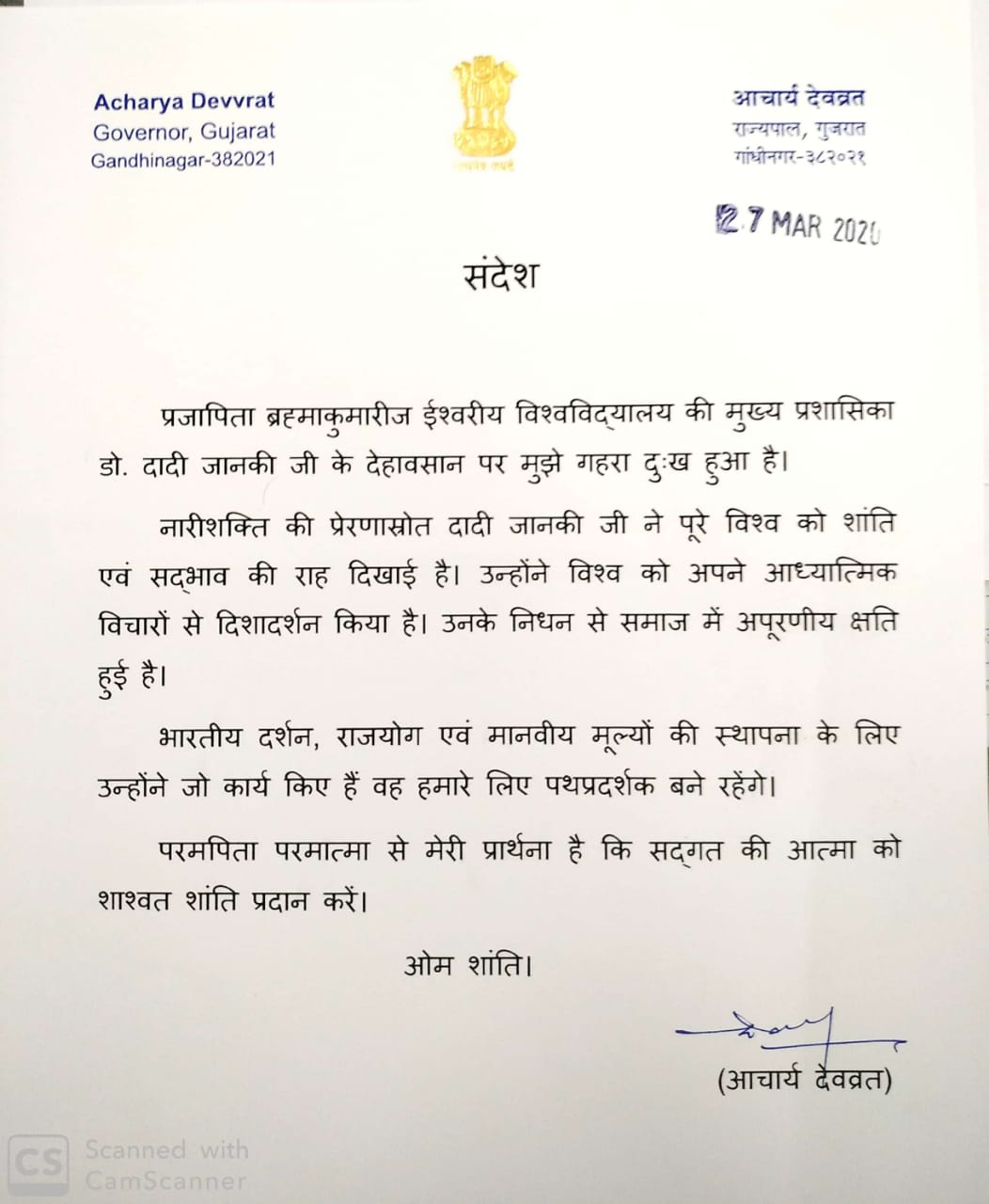 News Condolences to Dadi Janki from Governor & Chief Minister of Gujarat Published 6 years ago on March 30, 2020 By admin Hon’ble Governor of Gujarat Shri Acharya Devvrat Chief Minister of Gujarat Mr. Vijay Rupani Related Topics: Up Next Condolence Message to Rev. Dadi Janki from Sh. Prema Khandu, the Chief Minister of Arunachal Pradesh Don't Miss राजयोगिनी दादी जानकी जी के देहावसान पर राष्ट्रपति से लेकर प्रधानमंत्री ने ट्वीट कर जताया शोक Continue Reading Advertisement You may like