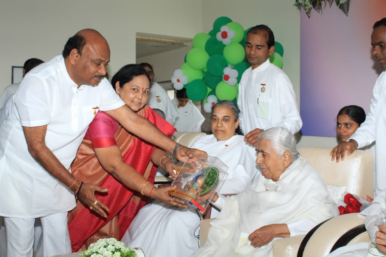 On the occasion, Dadi Janki was accompanied by BK Santosh and BK Godavari, both from Mumbai, and BK Hansa from Mount Abu. Present on the dais were BK Kuldeep from Shanti Sarovar, Hyderabad, BK Annapurna from Vijayanagaram, BK Rajani from Kakinada, BK Vijaya from Karimnagar, BK Sita, BK Veni, BK Manisha, and BK Shivalila.