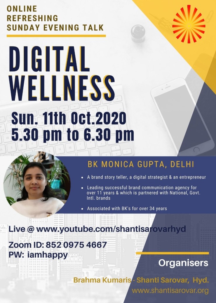 Brahmakumaris Delhi LIVE 11-10-2020, 5:30 pm : DIGITAL WELLNESS by BK Monica Gupta (Delhi) Published 5 years ago on October 10, 2020 By admin Related Topics:Brahmakumarisbrahmakumaris delhi Up Next LIVE 15-10-2020, 5:00 pm : PRESTIGE, MP | World Student’s Day | Self Motivation – Key To Success by Dr. BK Sunita Didi Don't Miss LIVE 11-10-2020, 5:30 pm : WORLD DAY OF GIRL CHILD | “MY VOICE, OUR EQUAL FUTURE” WEBINAR Continue Reading Advertisement You may like China (Guangzhou) News: Grand Reception on the Occasion of 79th Independence Day ब्रह्माकुमारीज़ मुख्यालय पहुंचे देशभर से राजा-महाराजाओं के वंशज Inaugural Session I SpARC Wing I Gyan Sarovar I Mt. Abu I Raj I 29/08/2025 Royal Family Spiritual Retreat | Inaugural Session | Brahma Kumaris | 28 Aug 2025 at 10 AM LIVE 25-08-2025 : 07.00am : दादी प्रकाशमणि जी की स्मृति दिवस | Dadi Prakashmani’s 18th Ascension Anniversary LIVE : विशाल रक्तदान अभियान | रक्तदान करें, जीवन बचाएं | Brahma Kumaris | Shantivan 23 Aug. 2025 Live : Universal Brotherhood Blood Donation Campaign I Social Service Wing I ORC,Delhi-NCR 17-8-2025 Dadi Prakashmani Mt. Abu International Half Marathon | RUN FOR UNIVERSAL BROTHERHOOD | Brahmakumaris Rakhi tied to President, Prime Minister, Ministers, Administrators,