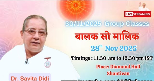 Brahma Kumaris LIVE: राजयोगिनी डॉ. सविता दीदी क्लास – बालक सो मालिक Published 2 days ago on November 28, 2025 By admin LIVE: राजयोगिनी डॉ. सविता दीदी क्लास – बालक सो मालिक || 28/11/2025, 11.30AM, Diamond Hall Related Topics:BrahmakumarisDr Savitalive Up Next Live: विश्व एकता और विश्वास के लिए ध्यान- BK Suraj Bhai Ji | Brahma Kumaris | Lucknow | 28 -11- 2025 10.00am Don't Miss Asha and others met Hon’ble Vice President of India Continue Reading Advertisement You may like Today’s 29-11-2025 Live from Shantivan Live: विश्व एकता और विश्वास के लिए ध्यान- BK Suraj Bhai Ji | Brahma Kumaris | Lucknow | 28 -11- 2025 10.00am Asha and others met Hon’ble Vice President of India LIVE | अव्यक्त सेवाओं के और अंतिम यात्रा – राजयोगिनी दीदी कमलेश जी | 24-Nov, 2025 | झांजीरीमंगला,कटक Closing of Security Service Wing Program Live: दिव्य अलौकिक प्रभु समर्पण समारोह – Brahma Kumaris, Phulbani | 21 Nov. 2025 | 12 :00 PM राजयोग की भूमिका : स्वस्थ, सुखी और तनाव-मुक्त जीवनशैली के लिए – BK Shivani Didi Launching Ceremony : Self Empowerment to Nation Empowerment Live: Golden Jubilee Celebration | Unit-9, Bhubaneswar |