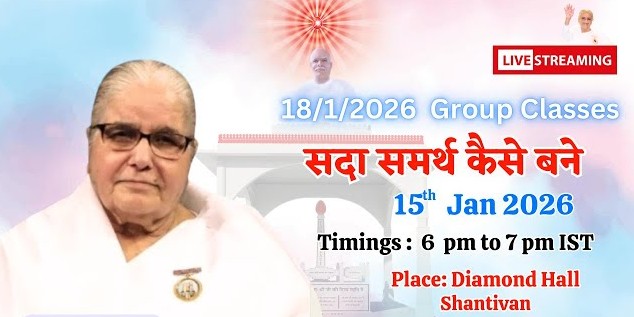 BK Santosh didi LIVE: राजयोगिनी संतोष दीदी क्लास – सदा समर्थ कैसे बने || 15/1/2026, 6 PM, Diamond Hall Published 6 hours ago on January 15, 2026 By admin LIVE: राजयोगिनी संतोष दीदी क्लास – सदा समर्थ कैसे बने || 15/1/2026, 6 PM, Diamond Hall Related Topics:BK Santosh DidiBrahmakumarislive Don't Miss LIVE: राजयोगिनी संतोष दीदी क्लास – बंधनमुक्त, जीवन मुक्त स्थिति || 12/12/2025, Continue Reading Advertisement You may like Live : नई सोच, नया जीवन, नई शुरुआत – BK Shivani I Brahma Kumaris Sidhpur I 16 Jan. 2026 I 4:30 PM Live : सदा स्वस्थ और खुशहाल जीवन की कला – BK Shivani I Brahma Kumaris, Himmat Nagar | 15 Jan. 4:30pm LIVE: राजयोगी मोहन सिंघल भाई क्लास – विघ्न से मुक्त होने की विधि || 15/1/2026, 10.30 AM Live: Celebration Compliment of 78 – BK Mrutyunjaya Bhai | Brahma Kumaris Bangalore | 08 Jan. 2026 नये वर्ष की नई उमंग – BK Raju Bhai Ji | Brahma Kumaris Bhinmal | 06 Jan.2025 | 10:00 AM Live: ब्रह्मा बाप समान बनने का प्रैक्टिकल प्लान – BK Suraj Bhai Ji | GGRC | 03 Jan. 10 am LIVE: आदरणीय राजयोगी करुणा भाई जी 87 वां जन्मोत्सव || 2/1/2026, 11 AM, Diamond Hall Live: वाह ज़िन्दगी वाह – BK E.V. Girish Bhai Ji | Brahma Kumaris, LIVE Today’s 31st Dec 2025, Avyakt Baba Milan from Shantivan