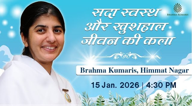 BK Shivani Live : सदा स्वस्थ और खुशहाल जीवन की कला – BK Shivani I Brahma Kumaris, Himmat Nagar | 15 Jan. 4:30pm Published 6 hours ago on January 15, 2026 By admin Live : सदा स्वस्थ और खुशहाल जीवन की कला – BK Shivani I Brahma Kumaris, Himmat Nagar | 15 Jan. 4:30pm Related Topics:BK ShivaniBrahmakumarislivenews Up Next Live : नई सोच, नया जीवन, नई शुरुआत – BK Shivani I Brahma Kumaris Sidhpur I 16 Jan. 2026 I 4:30 PM Don't Miss Live: सम्बन्धों में समरसता का आधार आध्यात्मिकता | BK Shivani | GGRC, Gujarat | 15 Jan. | 10:00 AM Continue Reading Advertisement You may like Live : नई सोच, नया जीवन, नई शुरुआत – BK Shivani I Brahma Kumaris Sidhpur I 16 Jan. 2026 I 4:30 PM LIVE: राजयोगिनी संतोष दीदी क्लास – सदा समर्थ कैसे बने || 15/1/2026, 6 PM, Diamond Hall LIVE: राजयोगी मोहन सिंघल भाई क्लास – विघ्न से मुक्त होने की विधि || 15/1/2026, 10.30 AM Live: सम्बन्धों में समरसता का आधार आध्यात्मिकता | BK Shivani | GGRC, Gujarat | 15 Jan. | 10:00 AM LIVE Rajyogi BK Suraj Bhai Ji -भट्टी का क्लास (Tuesday | Jan 13 2026) 9:30 AM to 1:00 PM मोहिनी दीदी और जयंती दीदी के साथ रूहरिहान Live: Celebration Compliment of 78 – BK Mrutyunjaya Bhai | Brahma Kumaris Bangalore | 08 Jan. 2026 नये वर्ष की नई उमंग – BK Raju Bhai Ji | Brahma Kumaris Bhinmal | 06 Jan.2025 | 10:00 AM Live: ब्रह्मा बाप समान बनने का प्रैक्टिकल प्लान – BK Suraj Bhai Ji | GGRC | 03 Jan. 10 am