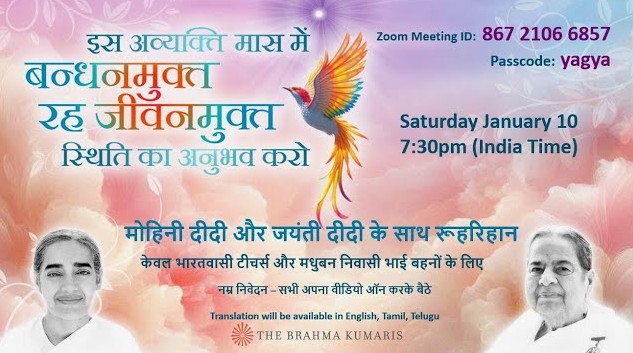 BK Jayanti मोहिनी दीदी और जयंती दीदी के साथ रूहरिहान Published 3 days ago on January 10, 2026 By admin मोहिनी दीदी और जयंती दीदी के साथ रूहरिहान Related Topics:bk jayantiBK Mohini Didilivenews Don't Miss LIVE: राजयोगिनी जयंती दीदी क्लास – चलन और चेहरे द्वारा बाप की प्रत्यक्षता || 28/12/2025, 10.30 AM Continue Reading Advertisement You may like LIVE Rajyogi BK Suraj Bhai Ji -भट्टी का क्लास (Tuesday | Jan 13 2026) 9:30 AM to 1:00 PM Live: Celebration Compliment of 78 – BK Mrutyunjaya Bhai | Brahma Kumaris Bangalore | 08 Jan. 2026 LIVE: आदरणीय राजयोगी करुणा भाई जी 87 वां जन्मोत्सव || 2/1/2026, 11 AM, Diamond Hall LIVE: राजयोगिनी उषा दीदी क्लास – नया वर्ष में पुरुषार्थ में नवीनता || 30/12/2025, 10.30 AM LIVE: राजयोगिनी जयंती दीदी क्लास – चलन और चेहरे द्वारा बाप की प्रत्यक्षता || 28/12/2025, 10.30 AM Live : संकल्प से सिद्धि – BK Shivani I Shanti Shikhar , Nava Raipur I 23 Dec 2025 I 7.00 AM Live: नवनिर्मित सद्भावना भवन का लोकार्पण समारोह | BK Jayanti Didi | Brahma Kumaris | 20 Dec. 2025 December 1, 2025 – Mohini Didi – कर्मातीत भव Live: संबंधों में सामंजस्य – Harmony in Relationships| BK Shivani Didi | Brahma Kumaris | 13 Dec.