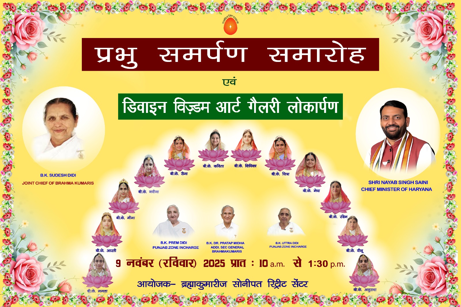 BK Sudesh प्रभु समर्पण समारोह एवं डिवाइन विजडम आर्ट गैलरी लोकार्पण | Brahma Kumaris | 09 Nov. 2025 | 10:00 AM” Published 2 hours ago on November 9, 2025 By admin Related Topics:BK Sudesh didiBrahma kumarislivenews Don't Miss अंतरराष्ट्रीय संबंधों में विश्व एक परिवार की भावना हो तो युद्ध नहीं हो सकता: केंद्रीय मंत्री उइके Continue Reading Advertisement You may like LIVE BK SHIVANI, Mind-Money Management | Brahma Kumaris | 07 & 8 Nov. 2025 | स्वास्थ्य, समृद्धि और खुशी का रहस्य | B.K. E.V. Girish | Brahma Kumaris, Beed | 5-11-2025 | 10:30 Am LIVE: ब्रह्माकुमारीज़ शांति शिखर का शुभ उद्घाटन | प्रधानमंत्री श्री नरेंद्र मोदी द्वारा | 01 नवम्बर” LIVE Today’s Avyakt Baba Milan 31st October 2025 Today’s 30-10-2025 Live from Shantivan Today’s 29-10-2025 Live from Shantivan Live : “Snehanjali Celebrating life of Rajayogi BK Brij Mohan Bhai Ji” from Talkatora Stadium,Delhi LIVE: दीपावली कार्यक्रम – 2025 || 90वां यज्ञ स्थापना दिवस कार्यक्रम || 21/10/2025, 10.30AM बी.के. बृजमोहन भाई जी के निमित Bhog Message BK Rukmani Didi from Shantivan, Abu Road 19-10- 2025