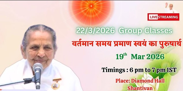 BK Sudesh didi LIVE: वर्तमान समय प्रमाण स्वयं का पुरुषार्थ- राजयोगिनी सुदेश दीदी क्लास – ||19/3/2026, 6 PM Published 6 hours ago on March 19, 2026 By admin LIVE: वर्तमान समय प्रमाण स्वयं का पुरुषार्थ- राजयोगिनी सुदेश दीदी क्लास – ||19/3/2026, 6 PM Related Topics:#SudeshDidi #Rajyoga #SelfTransformation #SpiritualGrowth #LiveClass #Meditation #SelfEffort #Puruarth #BrahmaKumarislive Don't Miss राजयोगिनी रजनी दीदी क्लास- अंतिम समय की तैयारी || 13/12/2025, 10.30 AM, Diamond Hall Continue Reading Advertisement You may like