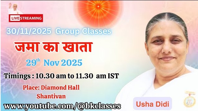 BK Asha 29-11-2025 Live Usha Didi, Asha Didi, Shushma Didi, Raju Bhai Published 3 weeks ago on November 29, 2025 By admin *10.30am उषा दीदी-जमा का खाता* *11:30am : आशा दीदी -पाप और पुण्य की गुहा गति* *05:30pm: सुषमा दीदी निश्चय बुद्धि विजयन्ती *06:30: राजू भाई जी कर्मातीत विक्रमजीत बनाने की विधि* Related Topics:BK Asha Didibk sushma didibk usha didiBrahmakumarislive Up Next LIVE: राजयोगिनी निरुपम दीदी क्लास – साक्षात बाप समान || 2/12/2025, 10.30 AM, Diamond Hall Don't Miss LIVE | अव्यक्त सेवाओं के और अंतिम यात्रा – राजयोगिनी दीदी कमलेश जी | 24-Nov, 2025 | झांजीरीमंगला,कटक Continue Reading Advertisement You may like Live: नवनिर्मित सद्भावना भवन का लोकार्पण समारोह | BK Jayanti Didi | Brahma Kumaris | 20 Dec. 2025 LIVE 04.30PM TIMELESS WISDOM OF BHARAT – SMT DROUPADI MURMU HAN’BLE PRESENT OF INDIA (HYDERABAD) Live: संस्कार परिवर्तन से संसार परिवर्तन – BK Shivani Didi | Brahma Kumaris, Patan | 19 Dec. 5:00 PM LIVE: राजयोगी आत्मप्रकाश भाई क्लास – योगी बनो – ज्ञानी बनो || 16/12/2025, 11.30 AM, Diamond Hall LIVE Today’s 15th Dec, Avyakt Baba Milan from Shantivan LIVE: राजयोगिनी शीलू दीदी क्लास – शांति की शक्ति || 14/12/2025, 10.30 AM, Diamond Hall Live: Diamond Jubilee Celebration & बिलियन मिनट्स ऑफ़ पीस अपील | 21-12-2025 राजयोगिनी रजनी दीदी क्लास- अंतिम समय की तैयारी || 13/12/2025, 10.30 AM, Diamond Hall LIVE: राजयोगिनी संतोष दीदी क्लास – बंधनमुक्त, जीवन मुक्त स्थिति || 12/12/2025,