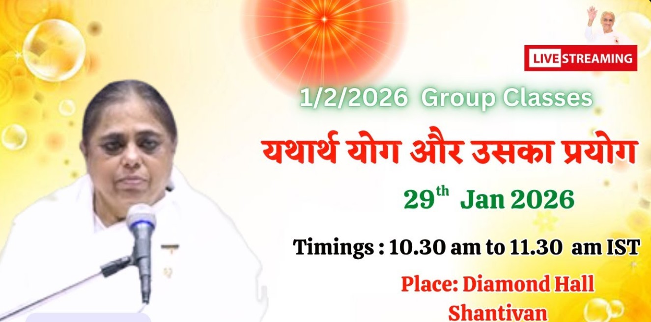 Brahma Kumaris LIVE: राजयोगिनी कृति दीदी क्लास – यथार्थ योग और उसका प्रयोग || 29/1/2026, 10.30 AM, Diamond Hall Published 3 hours ago on January 29, 2026 By admin LIVE: राजयोगिनी कृति दीदी क्लास – यथार्थ योग और उसका प्रयोग || 29/1/2026, 10.30 AM, Diamond Hall Related Topics:BK ClassBrahmakumariskurti didilive Don't Miss LIVE 🔴: 26 Jan. गणतंत्र दिवस की शुभकामनाएं | Live From Shantivan | Brahma Kumairs | 26 Jan. 2026 Continue Reading Advertisement You may like Live: Opening Ceremony of Brahma Kumaris, Trivandrum | BK Jayanti Didi | 29 Jan. 2026 | 09:00 AM Live:- सम्मान समारोह | Sammaan Samaaroh | Brahma Kumaris, Palakad | 27 Jan. 2026 9:00 AM LIVE 🔴: 26 Jan. गणतंत्र दिवस की शुभकामनाएं | Live From Shantivan | Brahma Kumairs | 26 Jan. 2026 Live: संगम: गौरवशाली वृद्धावस्था और सम्मान का जीवन।, Anjar Kutch (Guj)| 25 Jan. 2026 | 10:00 AM Live : Golden Jubilee Celebration | Brahma Kumaris Madurai | 25-01-2026 | 9:00 AM समय से पहले स्व-परिवर्तन रामनाथ भाई जी डायमंड हॉल LIVE Today’s 18 Jan 2026, Avyakt Baba Milan from Shantivan LIVE : 18 Jan. अव्यक्त स्मृति दिवस | Live From Madhuban | Brahma Kumairs | 18 Jan. 2026 LIVE: राजयोगिनी आशा दीदी क्लास-वृत्ति द्वारा वायुमंडल बनाने की सेवा | 16/1/2026 06.30pm
