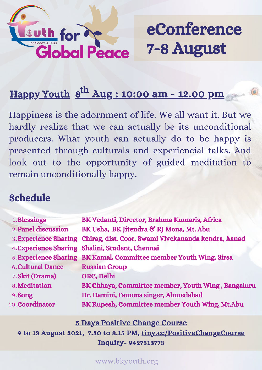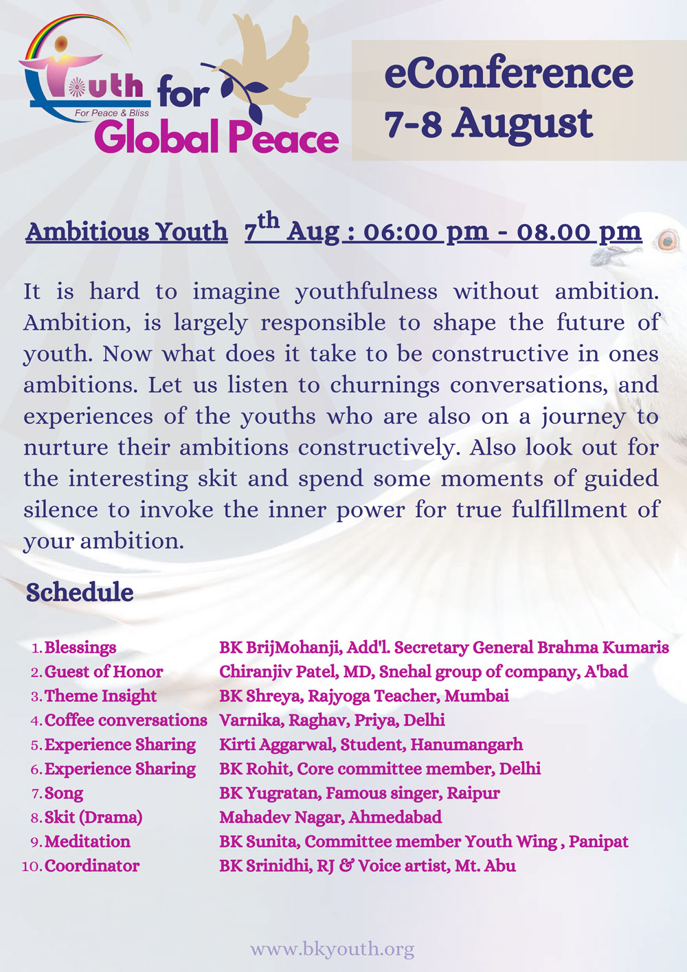 BK News 7 August, 2021 E – Conference – Youth for Global Peace Published 4 years ago on August 7, 2021 By admin Related Topics:bk newsBK ShivaniBK ushaliveyouth wing Up Next LIVE 13-15 August 2021 06.00pm : V I J A Y E E P A N D A V – Adhar Kumars Online Bhatti | Jayanti Didi | Don't Miss Annual regional retreat for centerwasis “Sadhana. Sewa. Siddhi” (Russia, CIS and Baltic countries, Ukraine, Mongolia, Georgia and Moldova) Continue Reading Advertisement You may like Inner Freedom Through Spirituality By BK Shivani August 2025 Youth Wing Retreat 5th to 9th June 2025 BK Shivani : Healing Relationships for Social Well-Being | Education For Holistic Well Being | LIVE : Jindagi bane Aasan by Usha Didi (Barabanki) Lucknow | 28-03-2025, 04.30pm LIVE : कल्याणपुर शिव गंगा रिट्रीट सेंटर कानपुर का भव्य उद्घाटन | बीके ऊषा दीदी जी | 27-03-2025, 4 PM ‘It’s Time’ by BK Sister Shivani in Bangalore at Koramangala Indoor Stadium! LIVE: ऊषा दीदी क्लास – योग के विभिन्न स्टेजेस – 8/3/2025, 10.30 AM, Diamond Hall नई सोच, नया जीवन, एक नई शरुवात | @bkshivani | वृन्दावन धाम, सूरत | 08-03-2025 | 05:30pm Invocation: Spirituality and Sustainable Development | BK Shivani | TERI | Brahma Kumaris